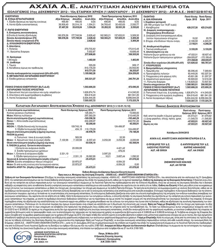 ΔΗΜΟΣΙΕΥΣΗ ΙΣΟΛΟΓΙΣΜΟΥ ΧΡΗΣΗΣ 2012 ΤΗΣ ΑΧΑΪΑ – ΑΝΑΠΤΥΞΙΑΚΗ Α.Ε.